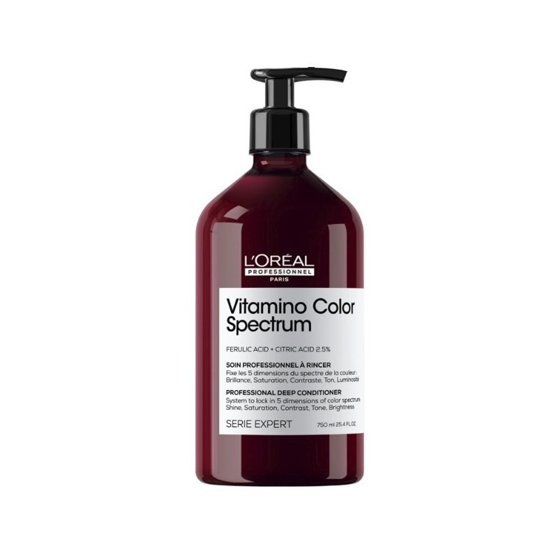 Odżywka z gamy Vitamino Color Spectrum od L'Oréal Professionnel Paris została opracowany dla wszystkich rodzajów włosów farbowanych. Kosmetyk wzmacnia włosy od wewnątrz, dzięki czemu stają się mocniejsze, gładsze i bardziej zdyscyplinowane. Wzbogacona o składniki odżywcze, kremowa formuła zapewnia efekt we wszystkich 5 wymiarach koloru**: ultramocny połysk tafli, bogate kolory, optymalną głębię odcieni koloru, brak niepożądanych refleksów oraz przejścia tonalne pomiędzy jasnymi i ciemnymi refleksami.