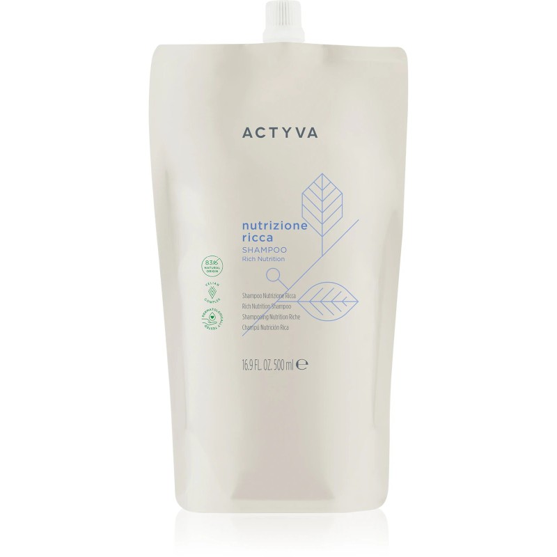 Szampon Kemon Actyva Nutrizione Ricca to pielęgnacja przeznaczona do włosów średniej grubości, bardzo suchych, wrażliwych oraz suchej skóry głowy. Delikatnie oczyszcza, zachowując naturalną równowagę skóry głowy. Odżywia i chroni włosy. Dodaje wyjątkowej miękkości i blasku, kontrolowanej objętości oraz ułatwia rozczesywanie.